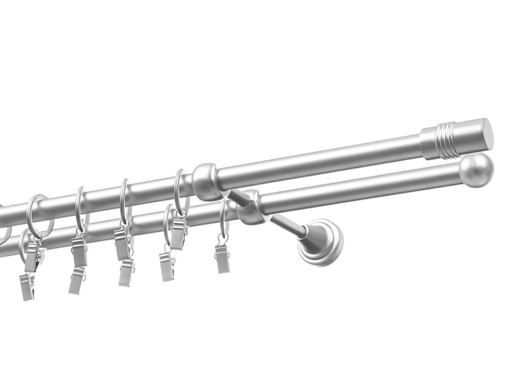 Délka tyče: 2x 2,0 m, konzole dvouřadá: 2 ks, koncovky: 2 ks, kroužek s žabkou: 32 ks, provedení : odstín stříbrná matná
